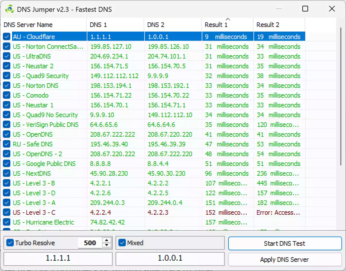 - Fastest DNS Test: Measure response times across listed servers, automatically sort them, and apply the fastest one with a click.