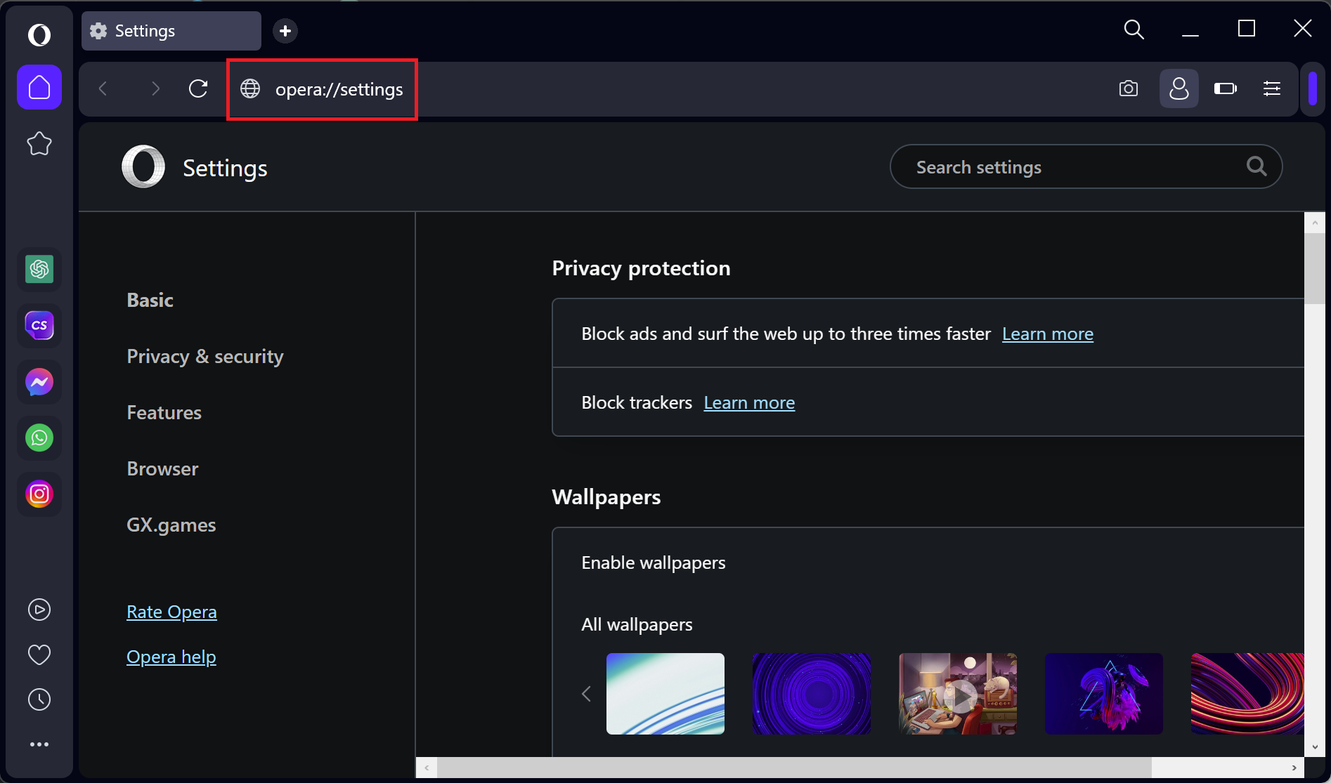 Step 2. In the address bar, type the following and press Enter to open the Opera Settings window:-
