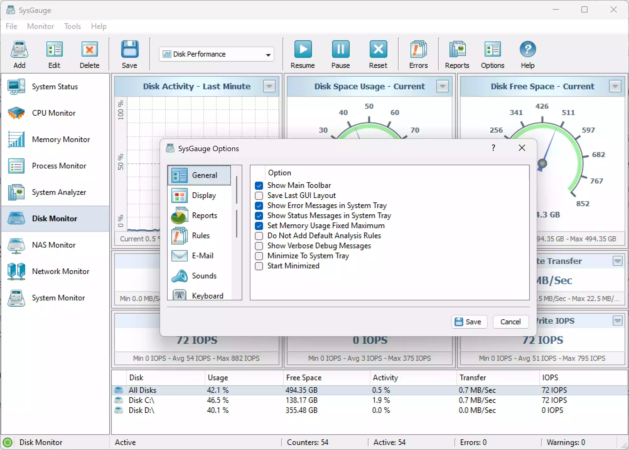 SysGauge is a powerful system-monitoring utility for Windows. It offers real-time tracking of essential system metrics like CPU usage, RAM consumption, disk activity, USB device usage, and network throughput. Unlike Windows’ built-in Resource Monitor, SysGauge provides greater flexibility, visual dashboards, and the ability to export performance data for analysis or reporting.