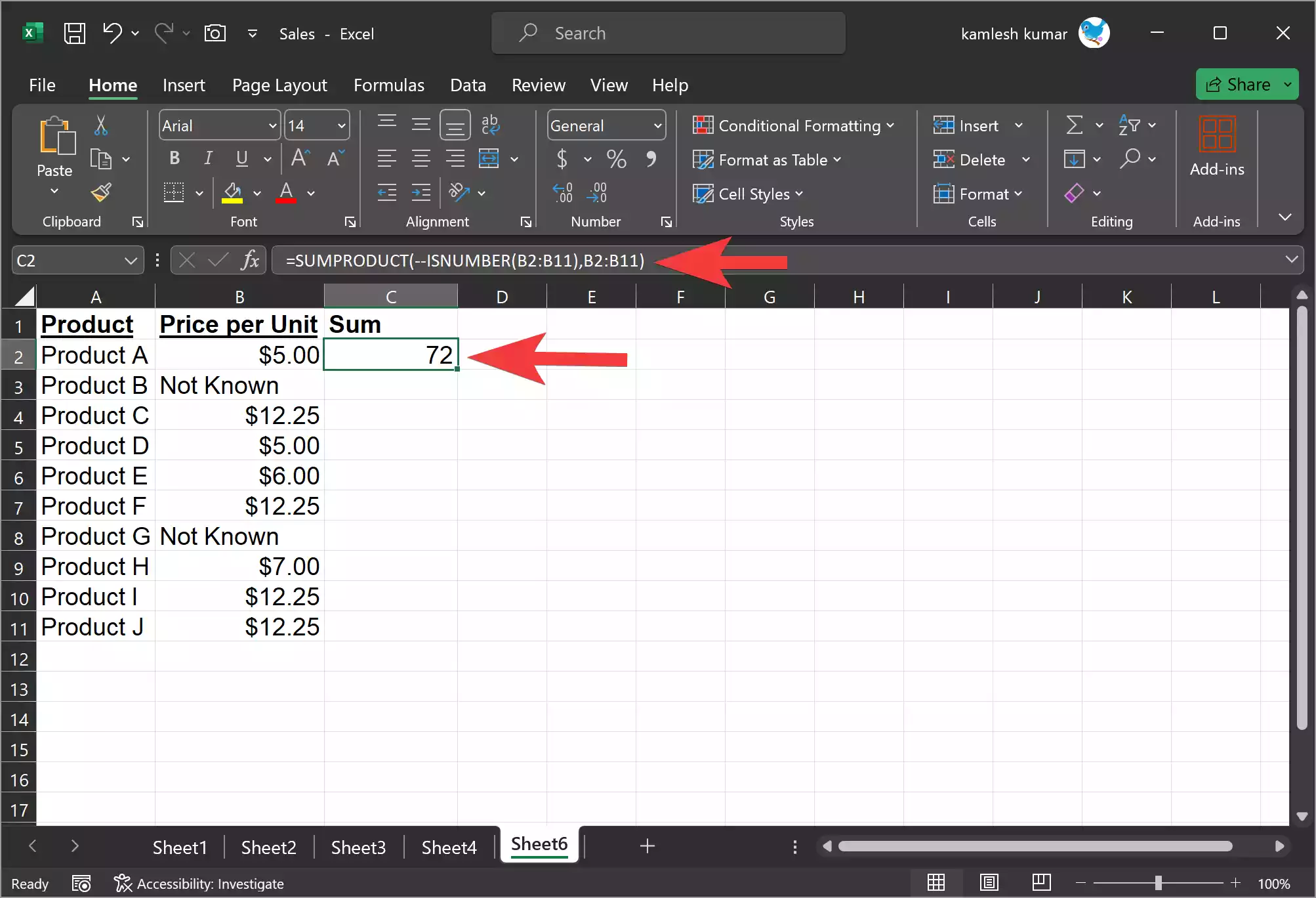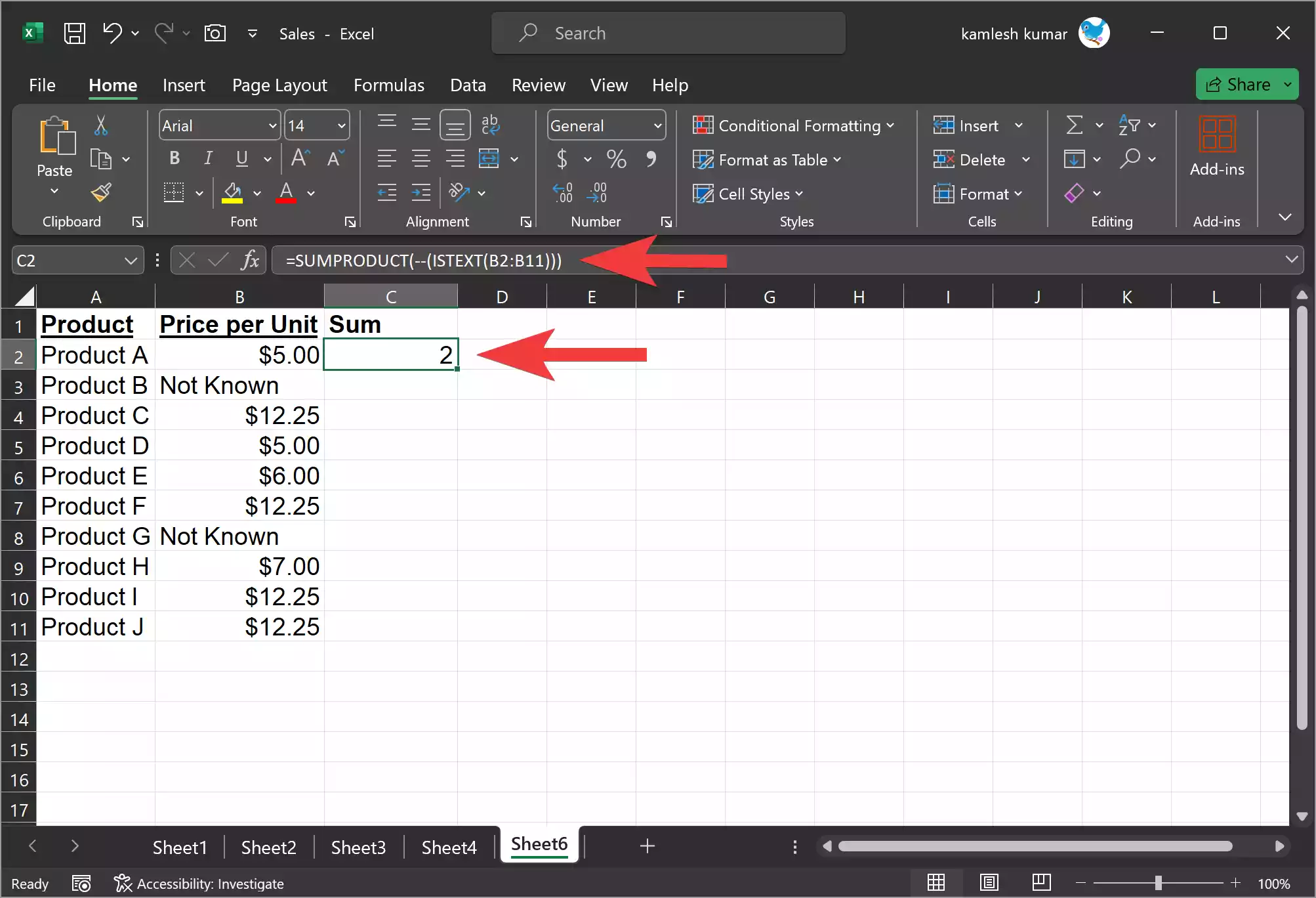 You’ll see TRUE in column C for the products without prices, helping you easily identify them.